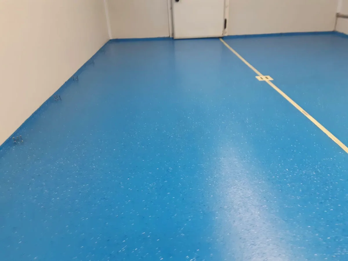 Byla provedena nová podlahová skladba s integrovanými fabiony, které zajišťují plynulý hygienický přechod mezi podlahou a stěnou. Fabiony eliminují ostré kouty, kde by se mohly usazovat nečistoty, a výrazně usnadňují sanitaci prostor.